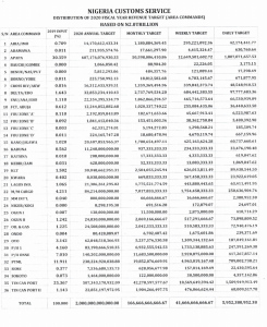 Apapa and Tin can Commands got the highest and second highest annual targets of N607,176,076,930.33 and N507,343,170,932.09 respectively. Apapa was also given a daily target of N1,807,071,657.53 and weekly target of N12,649,501,602.72 with a monthly target of N50,598,006,410.86.
