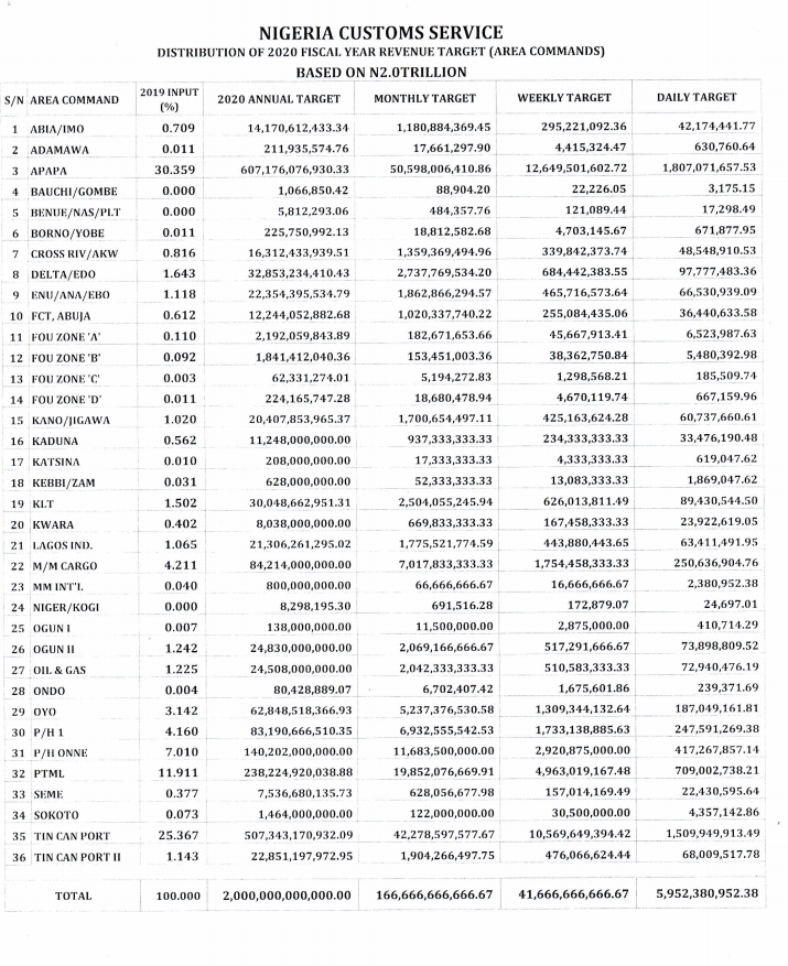 The Nigeria Customs Service has allocated revenue figures to various commands and areas to meet up N2trillion Target for 2020.