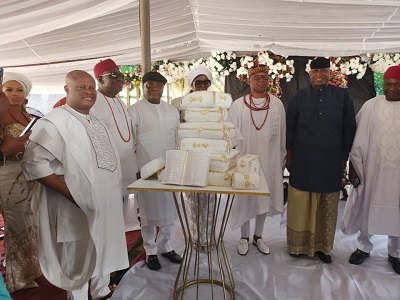 Chief Dr Austin Izagbo, Ogbueshi Adizue Eluaka, Barr Alex Onwudiamu,Ide Dr. Tony Nwaka, Dr Ben Iwezu,Barr Dennis Nwanokwai,Hon. Louis Ndukwe, Prince Rister Izedunor and others dignitaries graced the marriage ceremony in Ubulu-Uku Kingdom, Aniocha South LGA in Delta State.