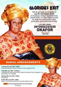 Also, on Saturday, 29th June, traditional Okanga Dance rites will be held, before Mkpami, the final burial rite will take place on 30th June 2024 at her paternal home Umuezebo, Ogbeowele, Ibusa.