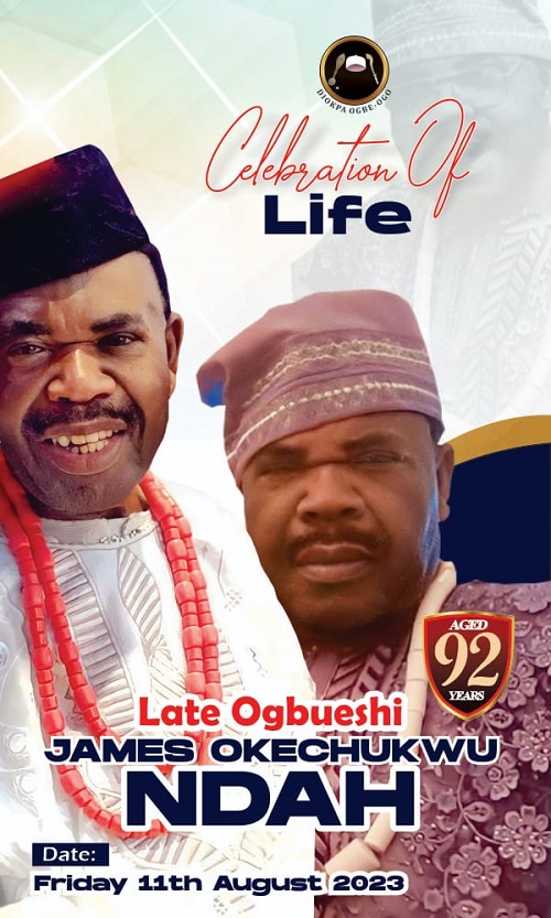 “It is with deep sadness and heavy hearts that we announce the passing away of Ogbueshi James Okechukwu Ndah(Diokpa of Ogbe -Ogo village, Asaba) who joined his ancestors on May 23rd, 2023.