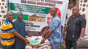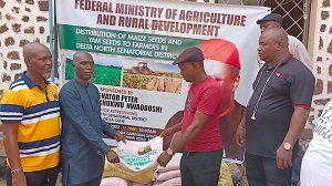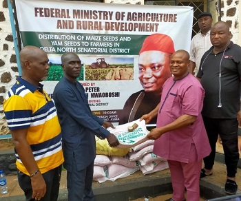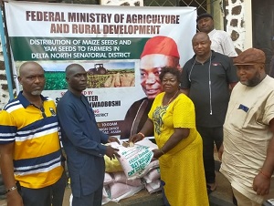 Senator Nwaoboshi who is the Chairman Senate Committee on Niger Delta Affairs distributed 120,000 Yam Seedlings and 2,500 bags of improved maize seed varieties to farmers across the nine Local Government Areas to boost farming activities in his senatorial district.